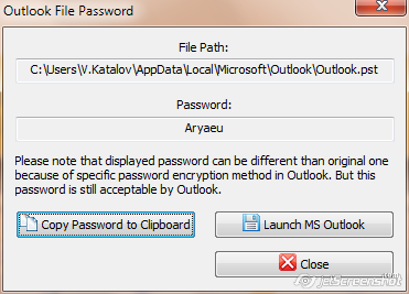Please note that in some cases, the password recovered by EINPB is not the same as the one which has been originally set. That's due to encryption algorithm used in Outlook – the original password is not stored in the file. But that password (shown by EINPB) will be accepted by Outlook without problems – just try. And of course, after logging into Outlook, you'll be able to change that password to any one, or just remove it. |